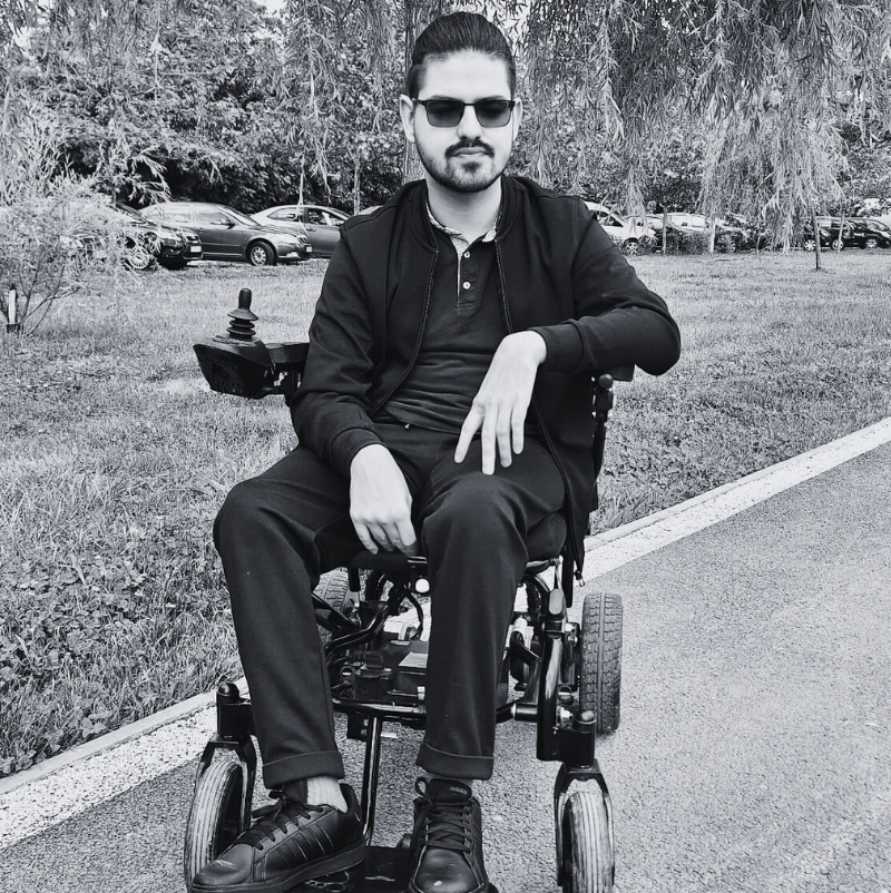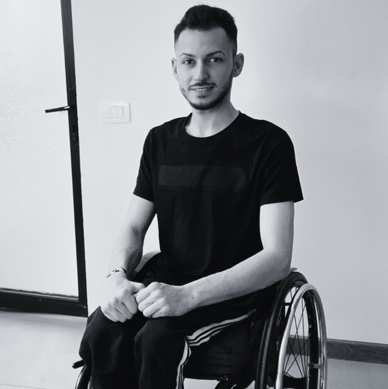 Am 25 de ani. Din cauza unui accident rutier în copilărie am rămas paralizat de la piept în jos, astfel că sunt dependent de scaunul rulant. Sunt un tip ambițios și optimist, din păcate nu mi-am terminat studiile, am 4 clase în țară și 3 în Italia, vorbesc fluent limba italiană. Mă bucur mult că am ocazia să joc într-o piesă de teatru, sper din suflet să reușesc să le transmitem oamenilor care ne privesc că viața merge înainte indiferent de probleme și trebuie să ne bucurăm la maxim de ea căci avem doar una.