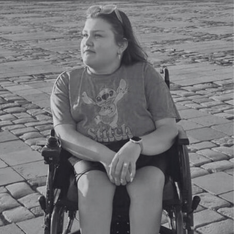 Am 15 ani și sunt purtătoare de o boală genetică care îmi oprește mușchii să funcționeze. Sunt elevă a Liceului Teoretic Constantin Brâncoveanu din Sectorul 1, București și sunt pasionată de teatru și muzică. În școala generală am făcut parte din trupa de teatru a școlii și am participat la multe concursuri pe care le-am și câștigat. Îmi doresc să joc în această piesă de teatru deoarece îmi pot trăi pasiunea. Sper ca fiecare spectator să plece cu bucurie în suflet și să înțeleagă că și persoanele cu handicap sunt la fel ca ele, doar puțin mai speciale.